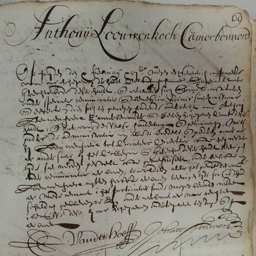 In the Register van de Curateelen, Leeuwenhoek has two pages, sharing the second with his cousin Lambrecht's son and notary Adriaan Leeuwenhoek, whose page had filled. On the left is page 69 (click to enlarge) showing Leeuwenhoek's appointment to the Touw and Van der Sijde estates.
