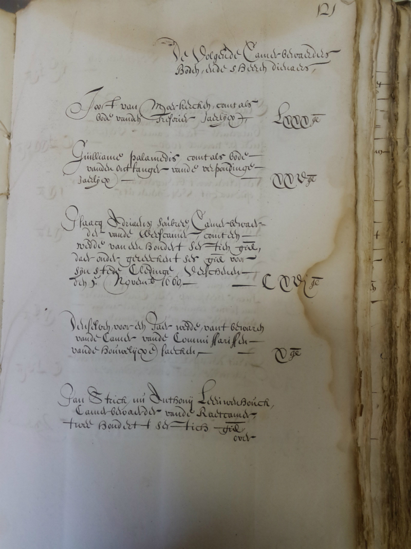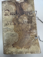In 1660, the year Leeuwenhoek began his long career as camerbewaarder of the magistrates' chamber, Andries van der Goes was treasurer. In that year's Rekeningen van de thesaurier, his account books (cover on the right; click to enlarge), the messengers are listed with the camerbewaarders after the city managers, doctors, and surgeons, but before the clergymen and other church workers such as the organists.
