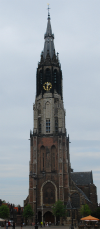 As for the tower, the first stone was laid in 1396. Under the supervision of Jacob van der Borch, it was finished in 1496. In a letter of March 14, 1713, to Jan Meerman, Delft's mayor, about the eye of a whale found at great depth in the ocean, Leeuwenhoek noted in a P.S. that he and Jacob Spoors had once measured the height of the tower, "each with his quadrant, and found it to be 299 feet."