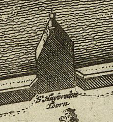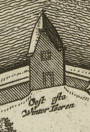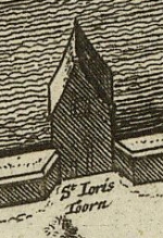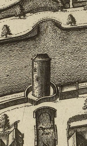 On all the maps, these three round towers look the same. On the Kaart Figuratief, they are square buildings flush with the city wall. The round part, more a hemisphere or half-tower, jutted from the wall over the little ledge into the singel. Two of the three towers survive; the Rietveltse Toren was recently renovated.