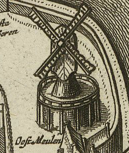 a post mill set on a wide base for turning the top part into favorable winds. It was on the east side of the Oostpoort's water gate to the Oosteinde gracht, so perhaps it was used similarly as the post mills at the end of the east-west grachts farther along the singel.