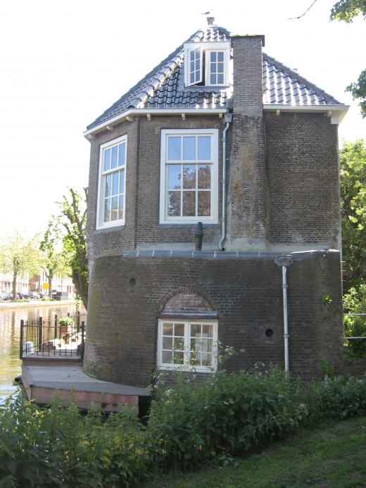 A three-story tower with roof set into an unraised, unfortified roundel perched over the end of the Geerweg gracht, also known as Kantoorgracht. All of the maps up until Blaeu's of 1649 show it as a windmill. Today's car-free Plantagebrug over the singel is a couple yards to the north. Duyvel's Gat and the Koepoortse Toorn were the only windmills built over water gates.