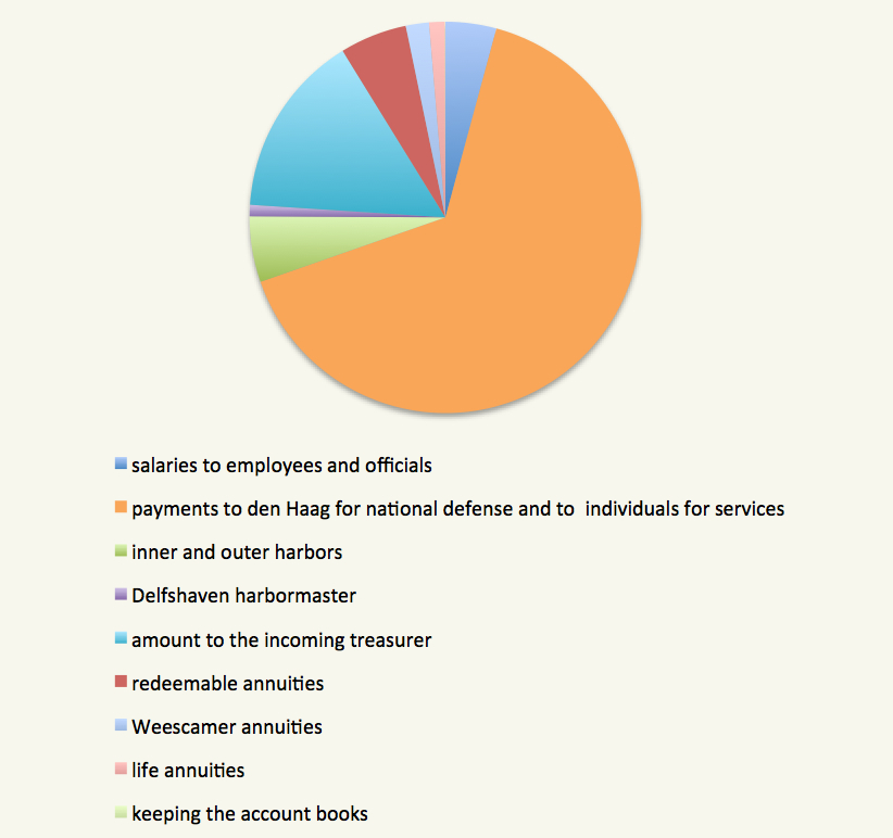 The table below shows theheadings and major subheadings that had totals and sub-totals in the Expenses section of the Rekeningbouck, the treasurer's account book. Some of them are very long and list the sub-subheadings; they have been shortened (though not re-worded) for this table. These section headings in the account books remained almost identical for years 1658 through 1681. The revenue/expense total of 630,060 guilders for 1678 was closer to the more common 400-500,000 guilders than to the excesses of 1674 and 1675, when it was almost triple that level, peaking at a little over 1.1 million guilders in 1675.