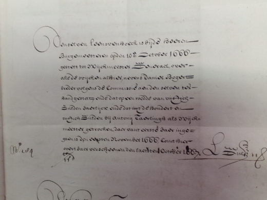 Den selven Leeuwenhoeck is bij de heeren Burgemeesteren op den 10th October 1666 gestelt tot Wijckmeester Generael over alle de wijcken alhier, nevens Daniel Bogaert breder volgens de Commissie aen den selven ter hand gestelt op een wedde van viftich gulden jaerlijcx ende dat init de hondert en vijftich gulders bij Antonij Taerlingh als wijckemeester getrocken, daer vant eerste jaer ingegaen is den eersten November 1666, comt hier over 't jaer verscheenen den laetsten October 1667. |