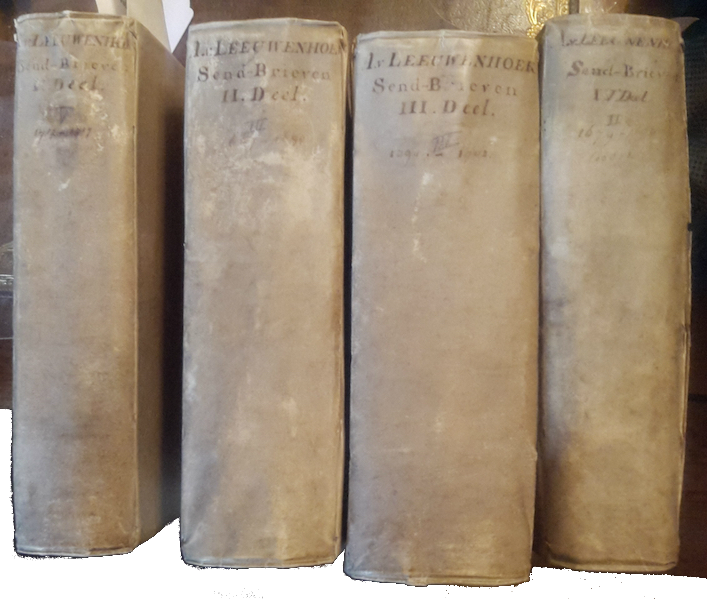 Who actually published it? The bookseller lists it as Leiden in 1695, yet the volumes were published separately from 1695 to 1697 and the final letter (Leeuwenhoek's # 107) was written to Hendrik van Bleyswijk on September 27, 1696. The two volumes from 1696 were originally printed in Leiden by Boutesteyn. The other two volumes, from 1695 and 1697, were printed by Kroonevelt, who lived next door to Leeuwenhoek on the Hippolytusbuurt in Delft. Because the Delft volumes were later, I suspect that the volumes in the photo were bound in Delft in 1697. Bookbinding was a separate craft, and Kroonevelt or Leeuwenhoek would have purchased that service separately. Who provided it, we'll never know.