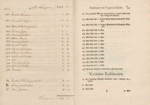 Bought 22 lots, containing 17 silver, 26 brass, and 12 unassembled microscopes for 77.3 guilders. He also bought two of the lacquered cabinets with drawers for 16.5 guilders. In total 12.7% of the yield of the auction.