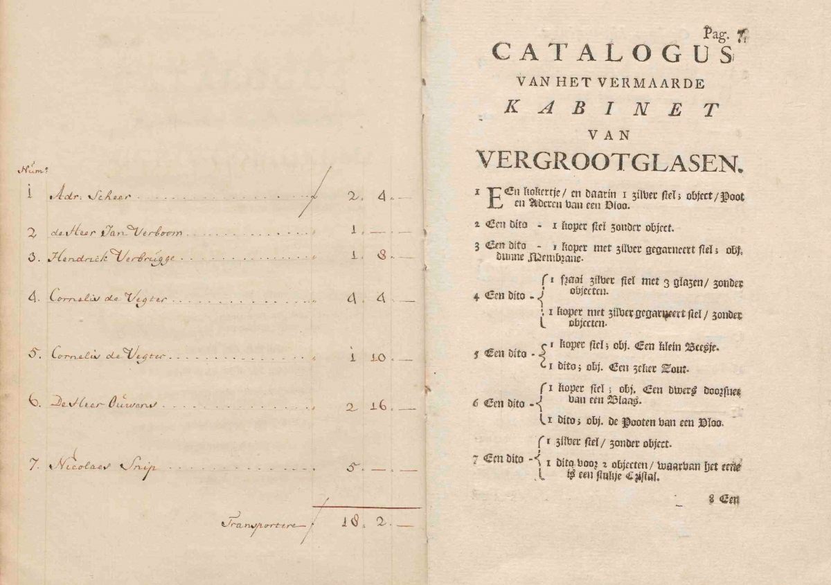 Lived in Vrijeban, just outside Delft in 1745. On page 7 of the catalogue (above right; click to enlarge), Adr. Scheer is the first buyer. He bought Een kokertje en daarin 1 zilver stel; object / Poot en aderen van een Vloo (A case and in it 1 silver piece; object / Leg and veins of a flea) for 2 gulden 4 stuivers.