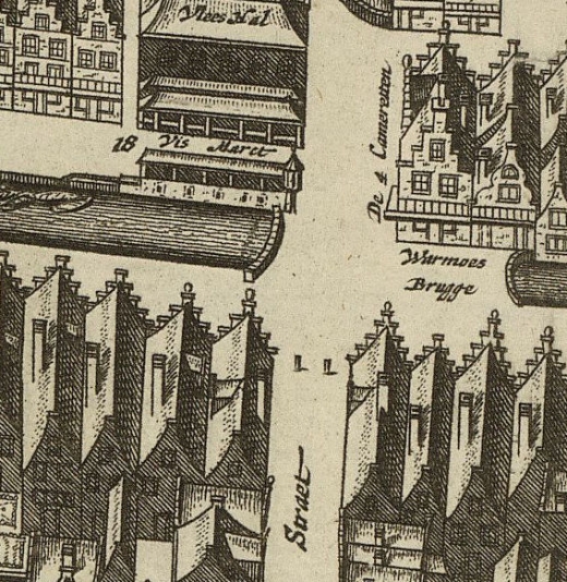 The Vismarkt is on the left. In his letter of January 14, 1678 to Robert Hooke, Leeuwenhoek wrote, "Between the sea fish market and my house is only a canal." The ancient fish market across the gracht from Leeuwenhoek's house specialized in sea fish, as opposed to the inland fresh-water fish market on the Oude Delft gracht.