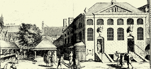 The Vleeshal is on the right. This stone building to replace the repeatedly burned wooden halls for the meat market was finished in 1650, just before Leeuwenhoek moved to the neighborhood. In 1871, it was renamed the Koornbeurs and is today a national monument.