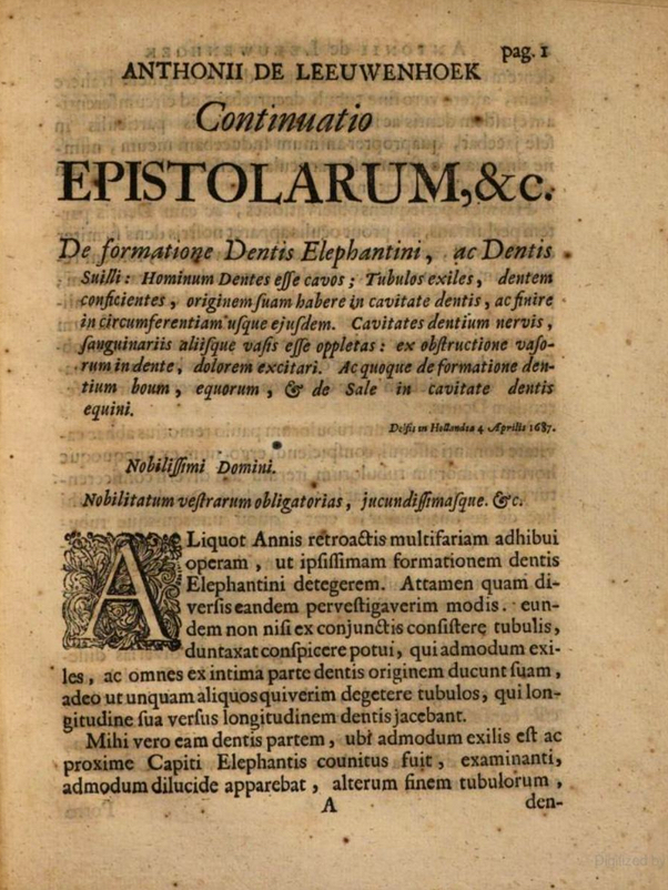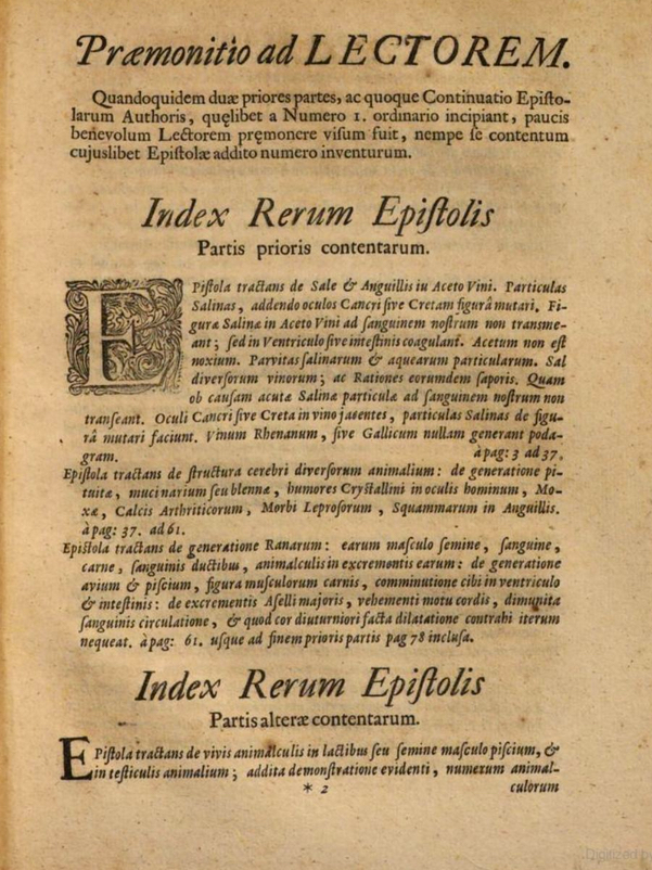 These eight consecutive letters were the longest batch Leeuwenhoek published up to this point. They were all addressed to the Royal Society. The volume must have been popular. It was bundled with other volumes and was reprinted four times, in 1696 as an Editio altera, in 1715 as a second edition, and in 1730 as the Editio tertio. Each used a different typesetting.
