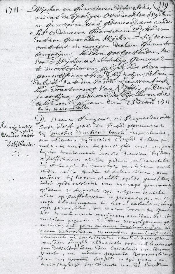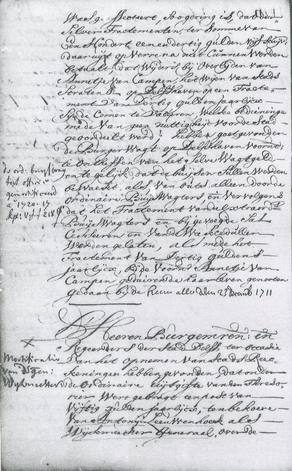 The mayors and managers of the City of Delft, on the occasion of the taking up the City Accounts, have found that under ordinary expenses of the Treasurer was an item of fifty guilders annually, to the benefit of Antony Leeuwenhoek as Wijkmeester-Generaal, over the districts and quarters of this city and that the oversight of same districts and quarters were entrusted to the six quartermasters that the general Wijkmeesters came to complicate, have approved annulling the previously named Wijkmeesterschap-Generaal, similarly, the compensation is annulled by them, except that the previously named Leeuwenhoek will retain the compensation of fifty guilders annually during his life. Done on 23 December 1711 by all the mayors.