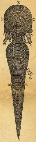 He had only only three letters printed as their own self-contained piece. The last of them was his letter to the Royal Society on September 7, 1688, quoted above and titled Den Waaragtigen Omloop des Bloeds, On the True Circulation of the Blood. The images accompanying it are below, illustrating the experiment that the aalkijker demonstrated for van Leeuwenhoek's visitors.
