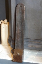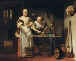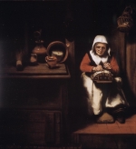The knife sharpening board (slijpplank) (left sidebar; click to enlarge) was wood but with water, sand, and a gritty powder, the cook would have keep her knives ready to prepare dinner. The paintings by Maes show some of the objects in the inventory: pots, jars, tin plates, woven baskets, wooden buckets, footwarmers, brooms, and brushes.