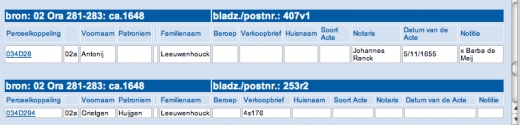 The screenshot below shows only two entries from the results of a search for Leeuwenhouck. Bron says that it came from the second source, the ORA (Old Judicial Archives) inv. 281-283, which dates from around 1648. Bladz./postnr. is the page/posting number; v1 means verso, column 1.