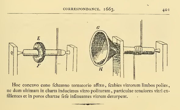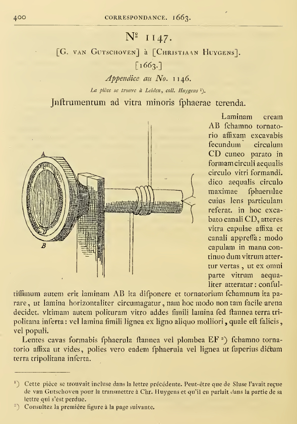 The undated enclosure in Sluze's August 1663 letter explains how to grind small lenses. Until then, Huygens had been more interested in and very successful at grinding lenses for telescopes. By the early 1660's, however, he became interested in small magnifying lenses, perhaps influenced by his acquaintances Spinoza and Johannes Hudde.