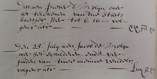 The image below comes from the treasurer's account book for 1673. It shows that Pieter d' Molijn, who apparently wasn't related to Jan, received 19 guilders 10 stuivers on July 23 for drawing three city maps (teickenen van drie stadts kaertjes). The next entry, two days later, shows Jacobs de Molijn receiving 54 guilders 14 stuivers for gilding two new vendels, which were the banners displayed by the civic guards. Jacob, Jan's father, had been dead for almost thirty years, so this must be Jan Jacobs.