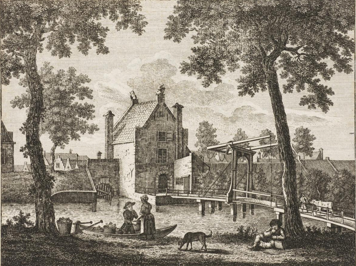 Blaeu's 1649 Delft Batavorum map (right) shows a small round tower to the south of the bridge where the gracht meets the singel. on the Kaart Figuratief, made thirty years later, the round tower is gone and a small house tops the land gate, owned by the city. This house was more for the gatekeeper who raised and lowered the drawbridge than it was for military defense. From 1694 to her death in 1733, the gatekeeper was Maria van der Hiel, wife of surgeon Johannes de Kets.