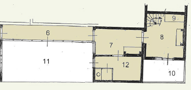 The back part of the lower floor had a courtyard (#11) separating the main house from the kitchen (#7) and backhouse and toilet (#12). Running along the southern wall was a gallery (#6), a covered hallway. For the first fifty years that Leeuwenhoek lived in the Gulden Hoofd, the back wall of the kitchen and back house was the end of his property.