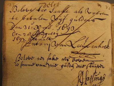 In 1693, Leeuwenhoek wrote a note in and signed the inscription book that Lijsbeth Noortbergen was circulating to raise money to pay for the ransom of her son Anthonij. The young man had been captured by pirates off the Barbary Coast and sold into slavery. On the chance that a ransom agreement could be made, Anthonij's mother wanted to be able to pay it.