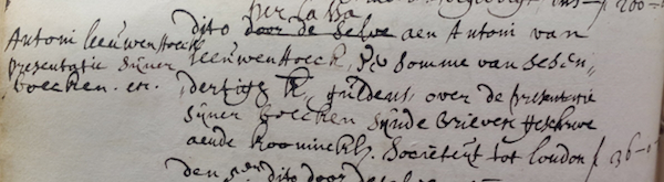 From the cashier to Antoni van Leeuwenhoeck, the sum of thirty-six guilders for the presentation of his books of his letters written to the Royal Society in London.