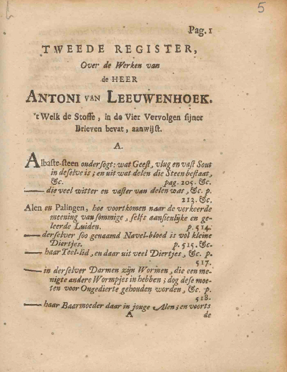 The Tweede Register Over de Werken van de Heer Antoni van Leeuwenhoek (Second Index of the Works ...) is on pages numbered 1-29. The rest of the title reads: 't Welk Stoffe, in de Vier Vervolgen sijner Brieven bevat, aanwijst (It designates which things are contained in the Four Continuations of his Letters)