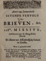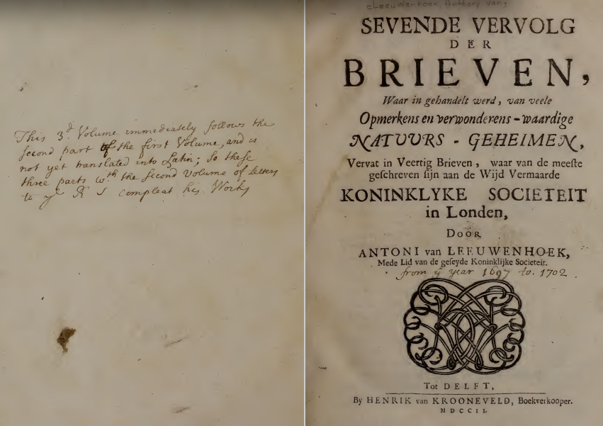 Similar to Sesde Vervolg. Note on blank page before the title page, in English (on right; click to enlarge): "This 3rd Volume immediately follows the Second part of the first Volume, and is not yet translated into Latin; So these three parts with the Second Volume of Letters to the R S compleat his Works." Since he did not publish more letters until 1718's Send-Brieven and the Latin translation of Sevende did not appear until 1719, this note must have been written between 1702 and 1718.