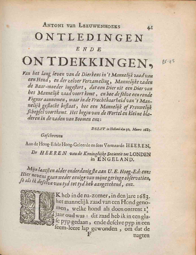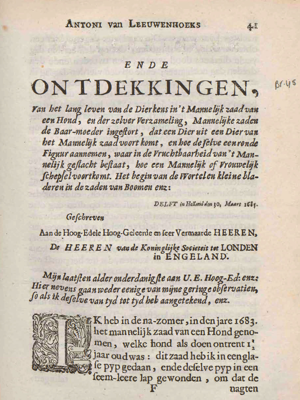 Letter 45 of March 30, 1685 (AB 84), about his discovery of sperm in a dog's uterus, with 6 figures.