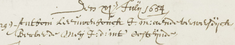 When Leeuwenhoek registered his engagement and marriage to Barbara de Meij in July 1654, he said he was living on the Verwersdijk, the last word on the middle line in the image below.