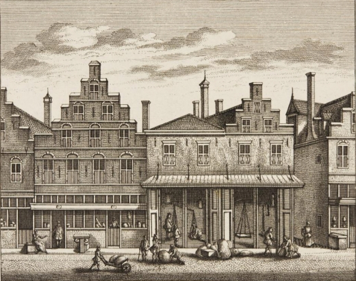 As shown in the plate below, the Waag is two buildings that have been connected by use since 1644. Art dealer Abraham de Coge bought the next-door basketmaker's shop for 2,957 guilders in 1642 and two years later sold it to the city for 5,800 guilders. By 1647, the building had been remodeled and a new scale was in place, three meters high and ten centimeters thick. According to F. ten Hengel in De Stad Delft, cultuur en maatschappij van 1572-1667 (p. 56), it was accurate to within two ounces.