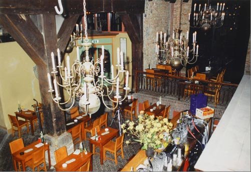 Connected by a common facade since 1769, the upper floors have had a variety of uses but the front part was used by the gold- and silversmiths' guild in Leeuwenhoek's time. Until 1960 it still functioned as a weigh-house. Today it is a restaurant (right; click to enlarge) whose interior has retained some of the look and feel of the Dutch Golden Age.