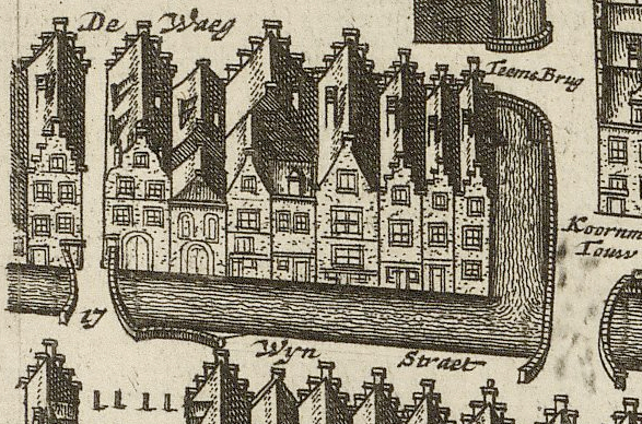 He worked at the Waag, the weighing house. Built after the city fire of 1536, it was on a narrow section of the Nieuwe Delft gracht, called Wijnhaven, right behind the Stadhuis. As shown on the map and photograph of the Wijnhaven below, the Waag bridge is #17 on the map on the left and the first bridge in the photograph below with the Warmoesbrug beyond it. The bridge stopped boat traffic, but not water, from going any farther.