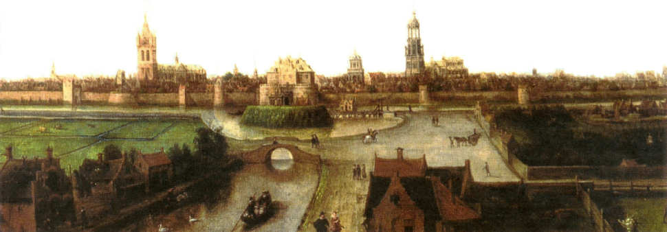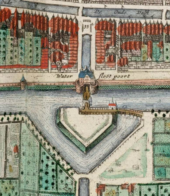 The Waterslootse Poort was for foot, horse, and carriage traffic only. A boat coming from the west into Delft on the Buitenwatersloot first had to pass under the low bridge across from the point of the bastion. Its bottleneck function can be seen more clearly in the Vroom panorama from 1618 below. The sloot and singel were shallow enough for pole barges, too shallow for masted boats that couldn't fit under the bridge, anyway.