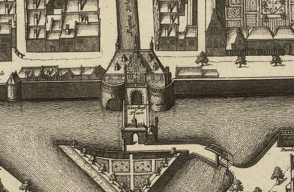 The other way in was to go left (north) at the bastion, along the singel (off the left of the map), under the Schoolpoort drawbridge and around to the water gate between the Wateringsepoort and the Haagpoort.