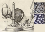 Drawing by Robert Hooke for Micrographia shows his illumination system (click to enlarge). On the right are two photos of the same piece of metal, dark field illumination on top and bright field illumination on bottom.